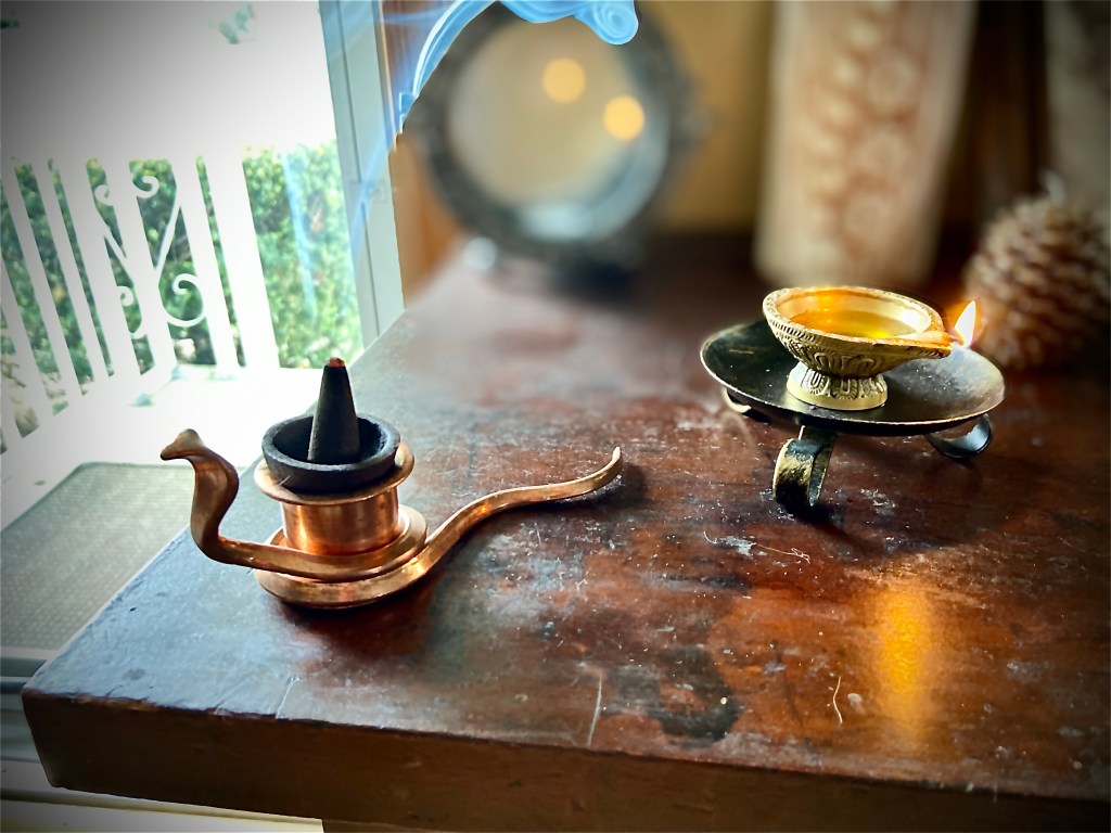 Every culture uses something that pleases the senses to help in their prayer or meditation practices. Incense or some kind of fragrance is helpful, because it alone can set the tone of a room. And smells are one of the things that we remember and associate experiences with often. Lamps or candles are often used too; I prefer oil lamps because the flame is steadier than the flicker of a candle; inviting the witness to slow way down and come home for a little while.